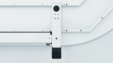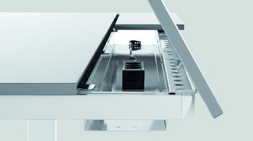 Beidseitig abklappbarer Kabelkanal und Kabeldurchlässe für die Kabelzuführung sowie die Montage der Bauteile der dritten Ebene
