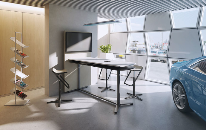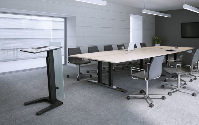Die Meeting-Reihe unterstützt die Kommunikation im Büro. Conference Besprechungstische in unterschiedlichen Geometrien erhalten Sie neben der starren Variante ebenfalls in elektromotorisch höhenverstellbarer Ausführung. So ermöglichen Sie wechselnde Besprechungssituationen, verhindern Müdigkeit und fördern effektive und lebendige Vorträge, Workshops, Seminare und Schulungen. Connect Meetingpoints laden in Mittelzonen von Open-Space-Büros zu Projekt- und Teamarbeit jenseits des Arbeitsplatzes ein. Ob im Stehen oder Sitzen – Versammlungen um die elektrifizierbaren Möbel mit standardmäßiger Ablage unter der Arbeitsfläche regen die Ideenfindung an. Alle Medienanschlüsse von Monitoren und Rechnern können in die Arbeitsfläche integriert werden, die weitere Verkabelung erfolgt unsichtbar. Ein Stehpult mit im Fuß eingelassenen Rollen und einer Ablage in Melamin, Furnier oder als Vollkernplatte sowie die vielfältig einsetzbaren Center-Tische mit ihrer breiten Auswahl an Fußdesigns runden die Meeting-Serie ab.