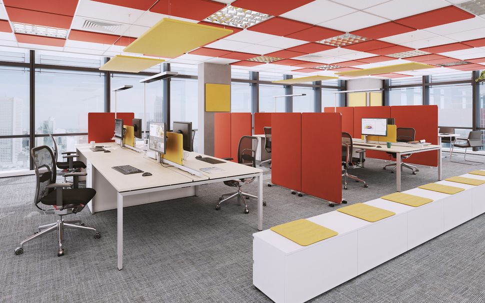 SpaceAbsorber wieder. Die Absorberlösungen für Wände und Decken sorgen für eine bessere Raumakustik, können flexibel im Büro positioniert werden und teilen ihn somit visuell und akustisch. Für die Herstellung der Absorber werden ausschließlich Materialien verwendet, die entweder bereits den Recyclingkreislauf durchlaufen haben oder dies tun können. In den SpaceAbsorbern stecken keine Verbundstoffe, deren physikalische Untrennbarkeit eine Aufbereitung verhindert. Somit entfällt auch der Einsatz von Klebern jeder Art. Stattdessen kommen Schraub- und Klemmsysteme zum Einsatz. So können Kundinnen und Kunden die Produkte nach Belieben anpassen.