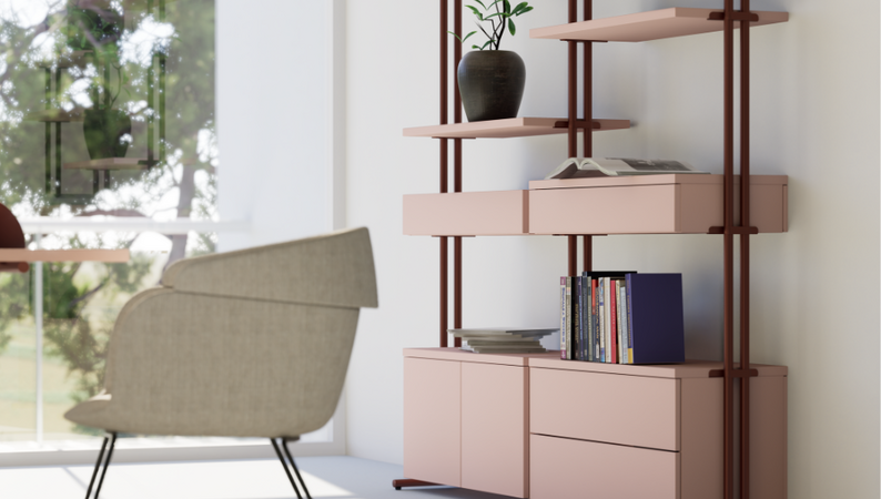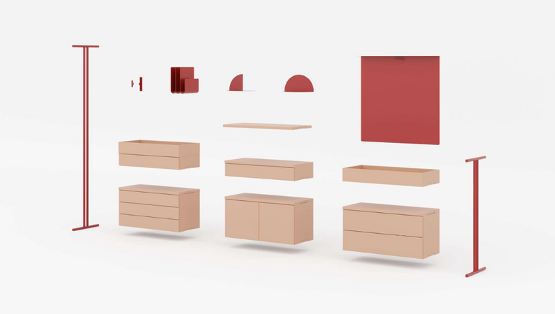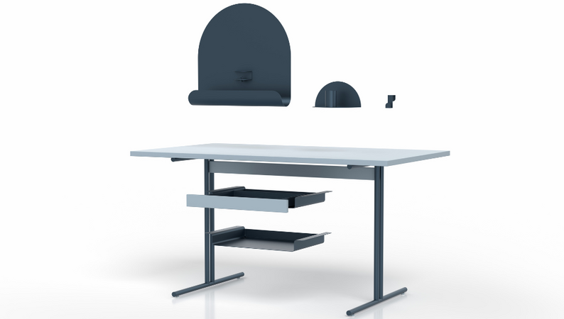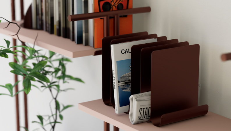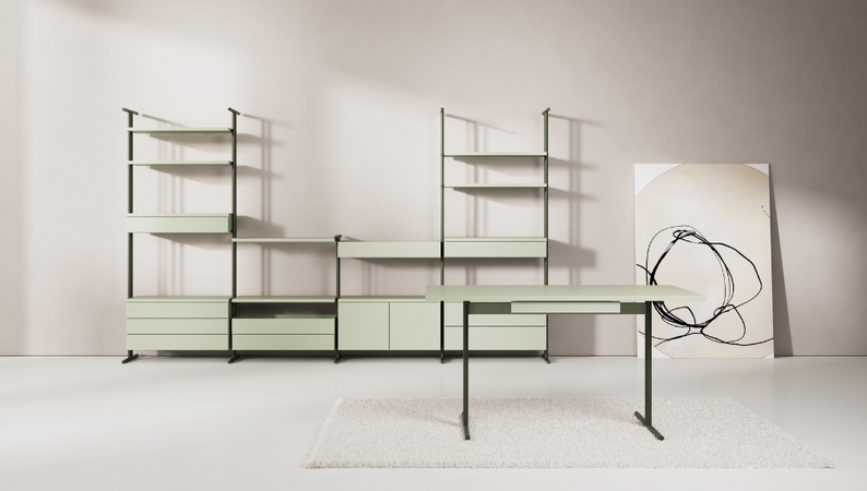 Leichte, stilvolle Module in Form von Ablageböden, Ablageschalen, Schubladen- und Türenelementen sowie praktisches Zubehör wie den Buchstützen oder der Metalltafel bieten passgenaue Lösungen für nahezu jede Arbeitssituation. Ändert sich diese einmal, können sich die Regalkompositionen durch den besonderen Clou, der raffinierten Metallklammer, jederzeit mühelos aufs Neue an die Bedürfnisse des jeweiligen Nutzers anpassen. Die beiden Pfostengrößen bieten darüber hinaus die Option, ein Regal in ein Sideboard zu verwandeln und umgekehrt.